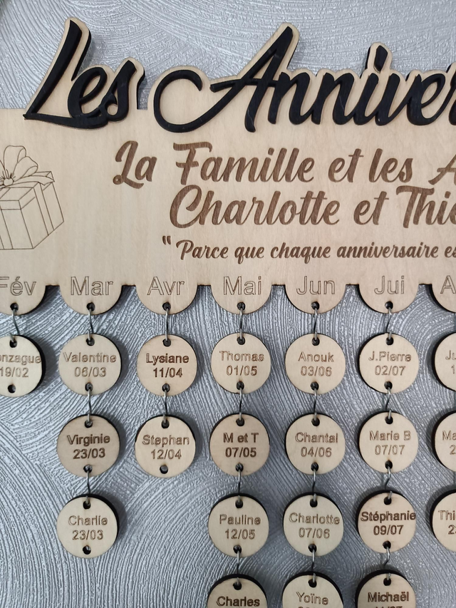 Calendrier d'anniversaires personnalisé en bois, parfait pour organiser et célébrer les dates spéciales de la famille et des amis.