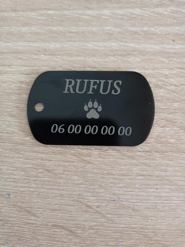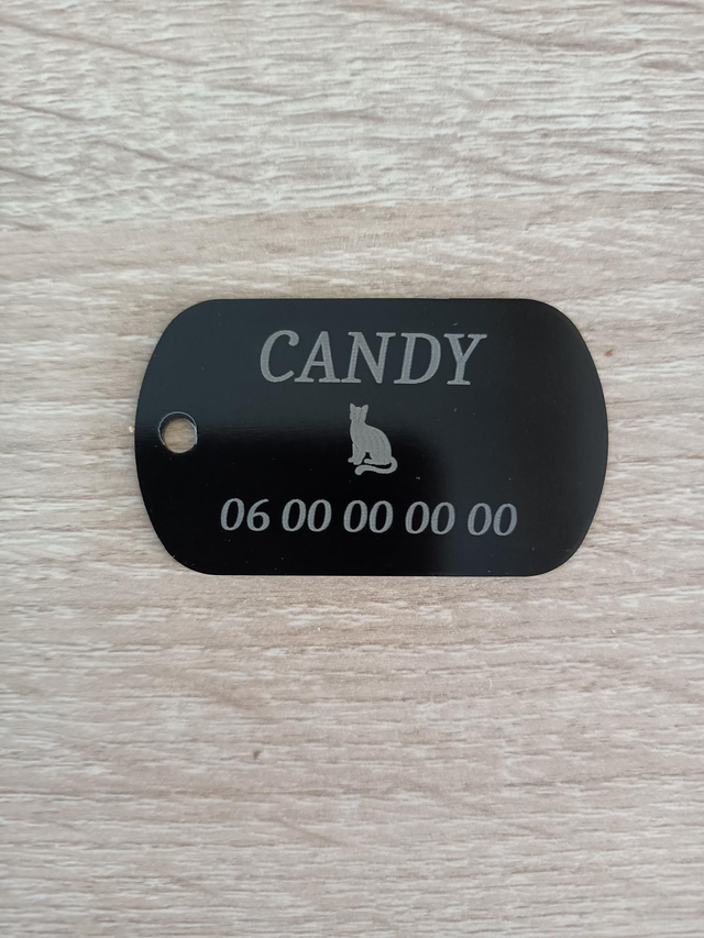 D'une belle couleur noire, en aluminium d'une taille de 50 x 30 mm, gravure personnalisée suivant vos envies ou besoins.